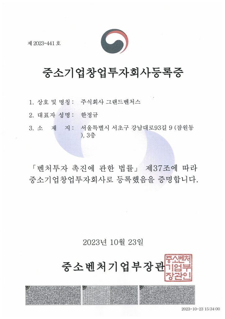 2023년 10월 23일, 그랜드벤처스(대표 파트너 한정규)가 중소벤처기업부 중소기업 창업투자회사로 등록되었습니다.